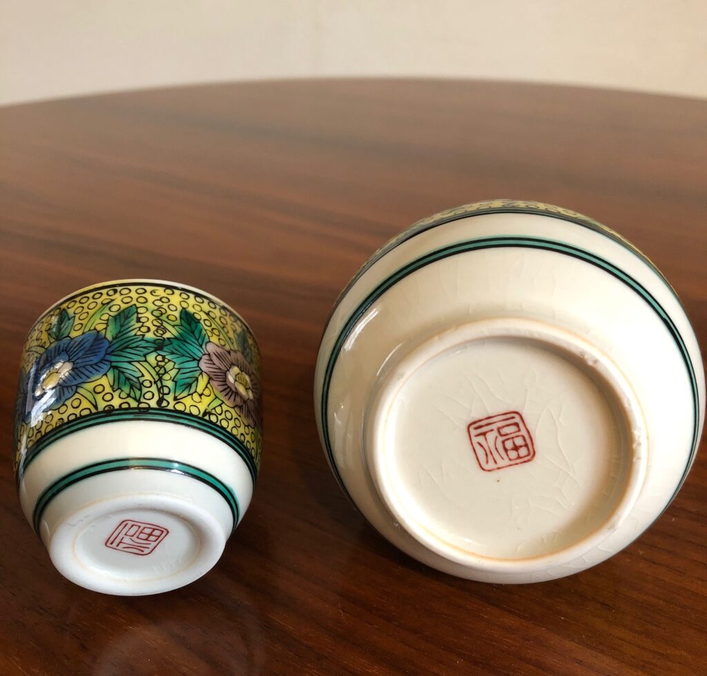 青手九谷のような色合いの鮮やかな色彩で青と紫の花が絵付けされています。