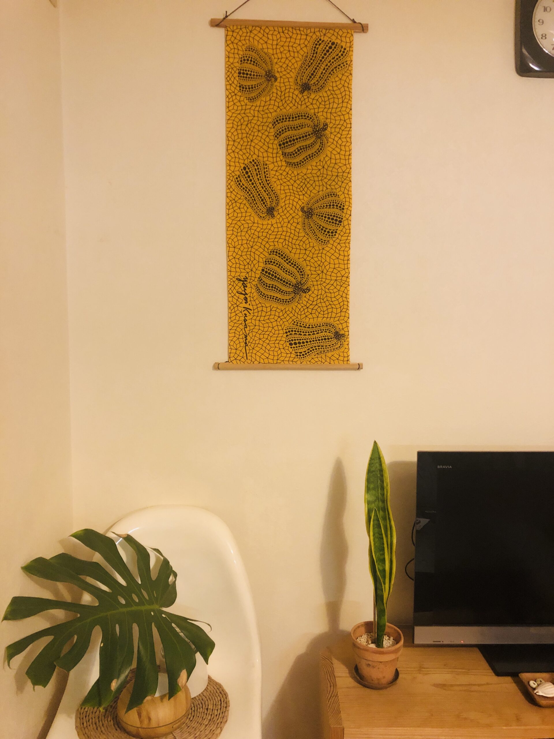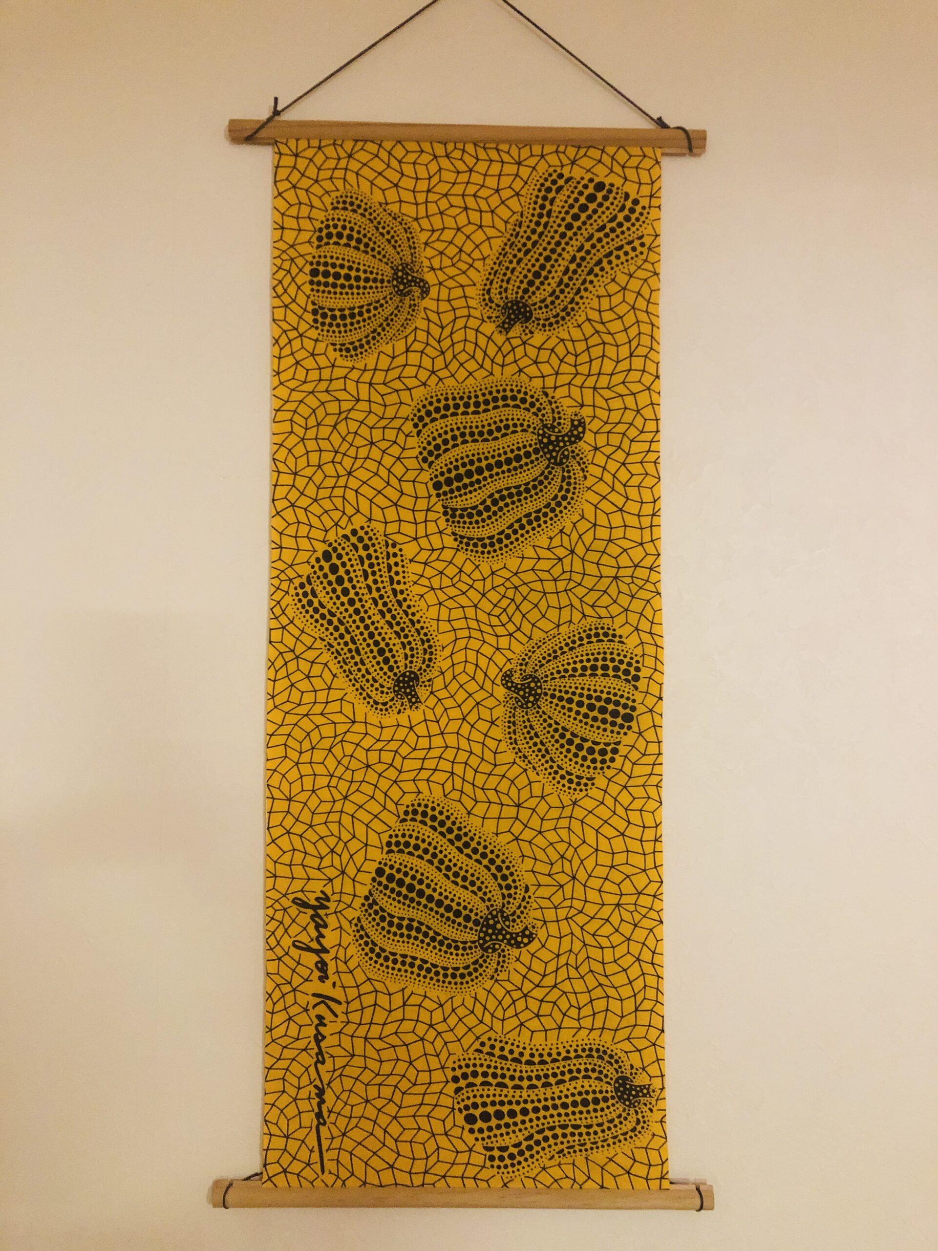 ハロウィンのタペストリー 草間彌生の手ぬぐい インテリア 2025/10/282025/10/29 ハロウィンの時期になったので、リビングのタペストリーをかぼちゃ柄に模様替えしました。 草間彌生の手ぬぐいです、網目の中にドット柄のかぼちゃが浮かんでいます。 きれいなオレンジ色なので気分も明るくなります♪